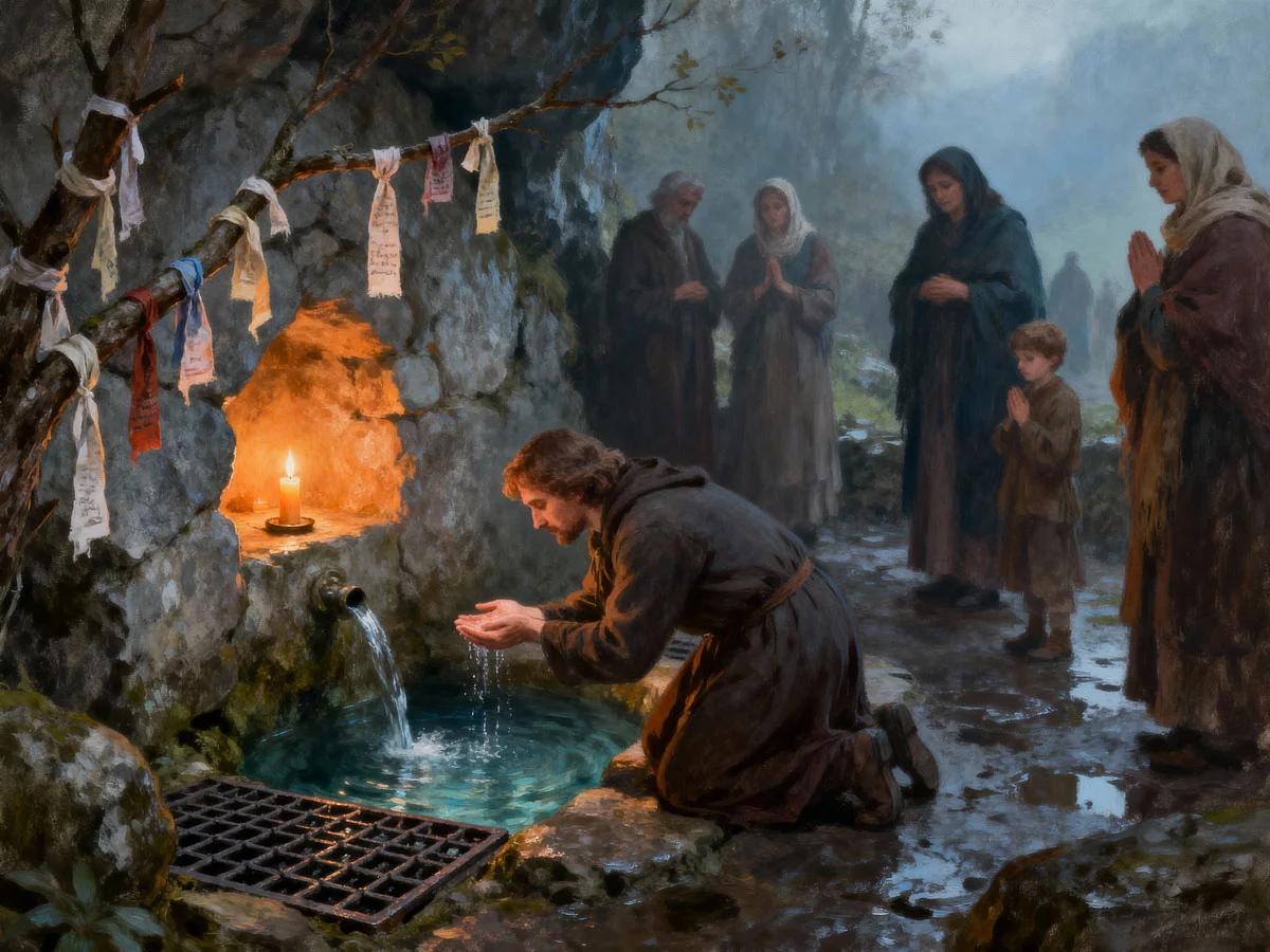 The Water: First, they approach the spring itself. They cup the cold, clear water in their hands to drink, or to bless themselves. Many bring bottles to carry the healing water home to those who cannot travel.