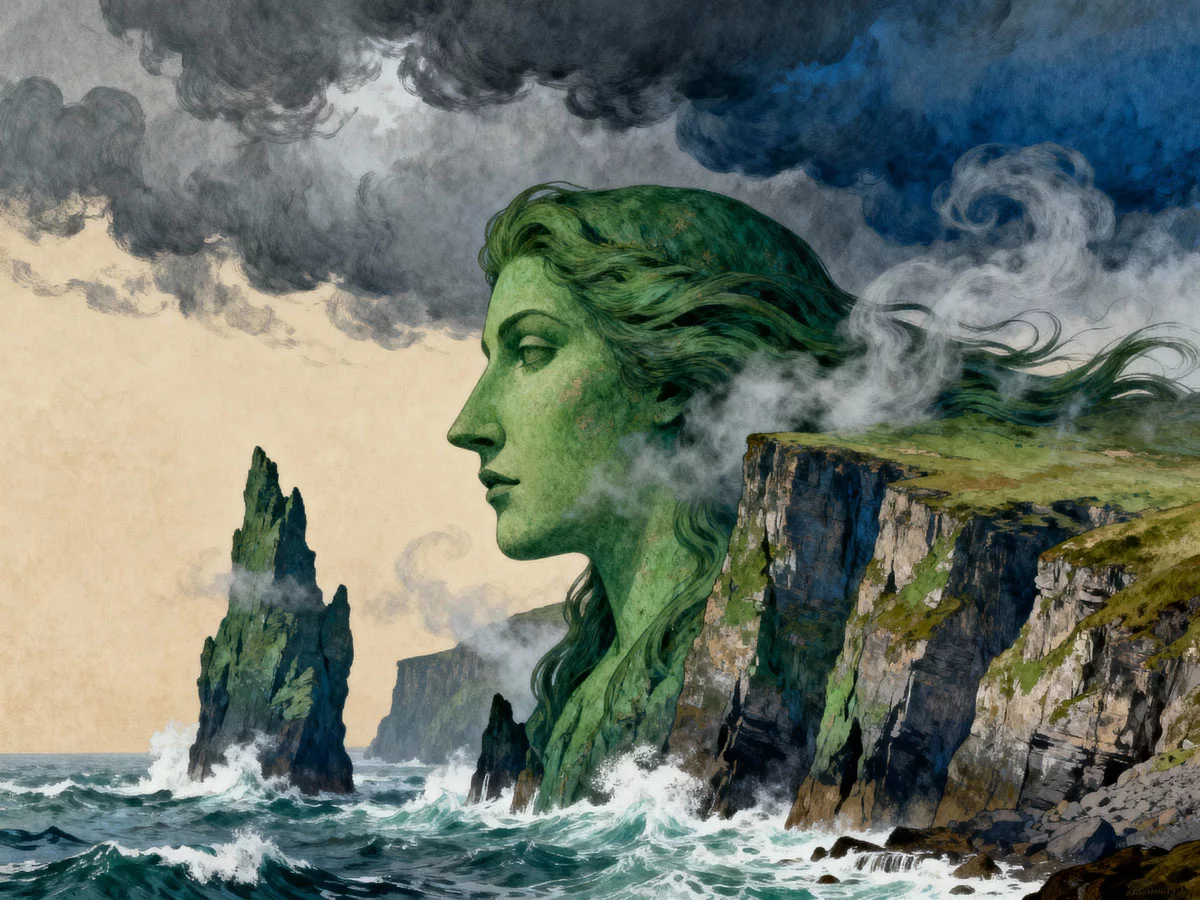 She plummeted down, her body smashed against the merciless rock below. But the death of such a powerful being is never simple. As her life was extinguished, her potent spirit flooded into the cliffside. The ancient stone, witness to her final moments of love and rage, reshaped itself. And there, etched into the headland for all time, her profile was frozen—a sharp nose, a jutting chin, and the wild sweep of her hair. The place would forever be known as Hag's Head (Ceann na Caillí), a permanent monument to a love that was powerful enough to scar the very face of Ireland.