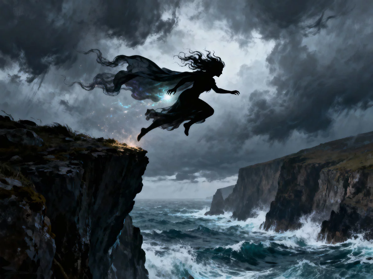 Blinded by her passion, Mal did not hesitate. She gathered all her magic, all her rage, and all her longing into a single, desperate leap. For a moment, she hung in the air, a dark silhouette against the grey sky. But her magic, rooted in the earth she was leaving, failed her. Her power, built on obsession rather than skill, faltered. Her foot slipped, her balance was lost, and with a final, soul-shattering shriek that was swallowed by the wind, she fell.