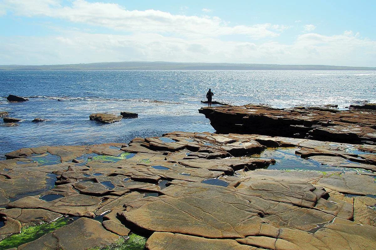 Hike the coastal path towards Clahane, with rugged stone walls, fossils, and tidal pools.
