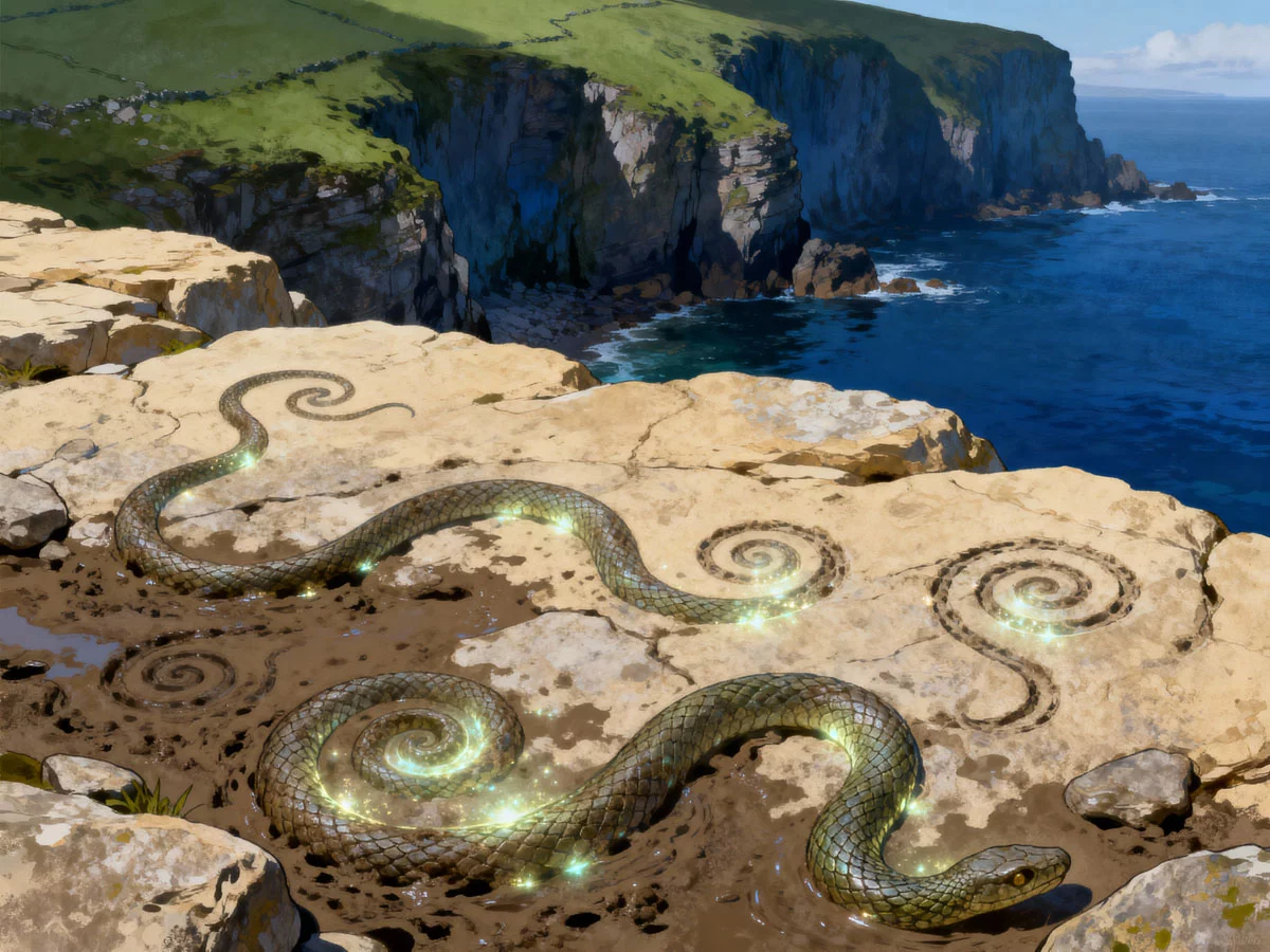 Long before science gave them names like ammonites and goniatites, the people who quarried the dark, layered flagstone around Liscannor knew the strange shapes locked within it. They saw them with their own eyes: perfect spirals like coiled serpents, and winding, wavy tracks that looked for all the world like the path of a slithering snake, frozen in mid-motion. They were beautiful, mysterious, and unsettling. And to explain them, they told a story not of geology, but of a great miracle.