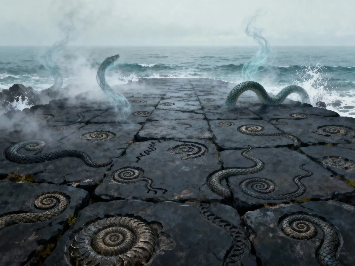 Their coiled bodies and slithering forms were captured forever, transformed from living flesh into fossilised rock. The land was cleansed, the old ways were defeated, and the proof of the miracle was permanently etched into the very stone of County Clare. From that day on, every time a quarryman splits a slab of Liscannor stone and finds a perfect "snakestone," he is not just finding a fossil; he is holding a testament to the saint's power, a serpent conquered by faith.