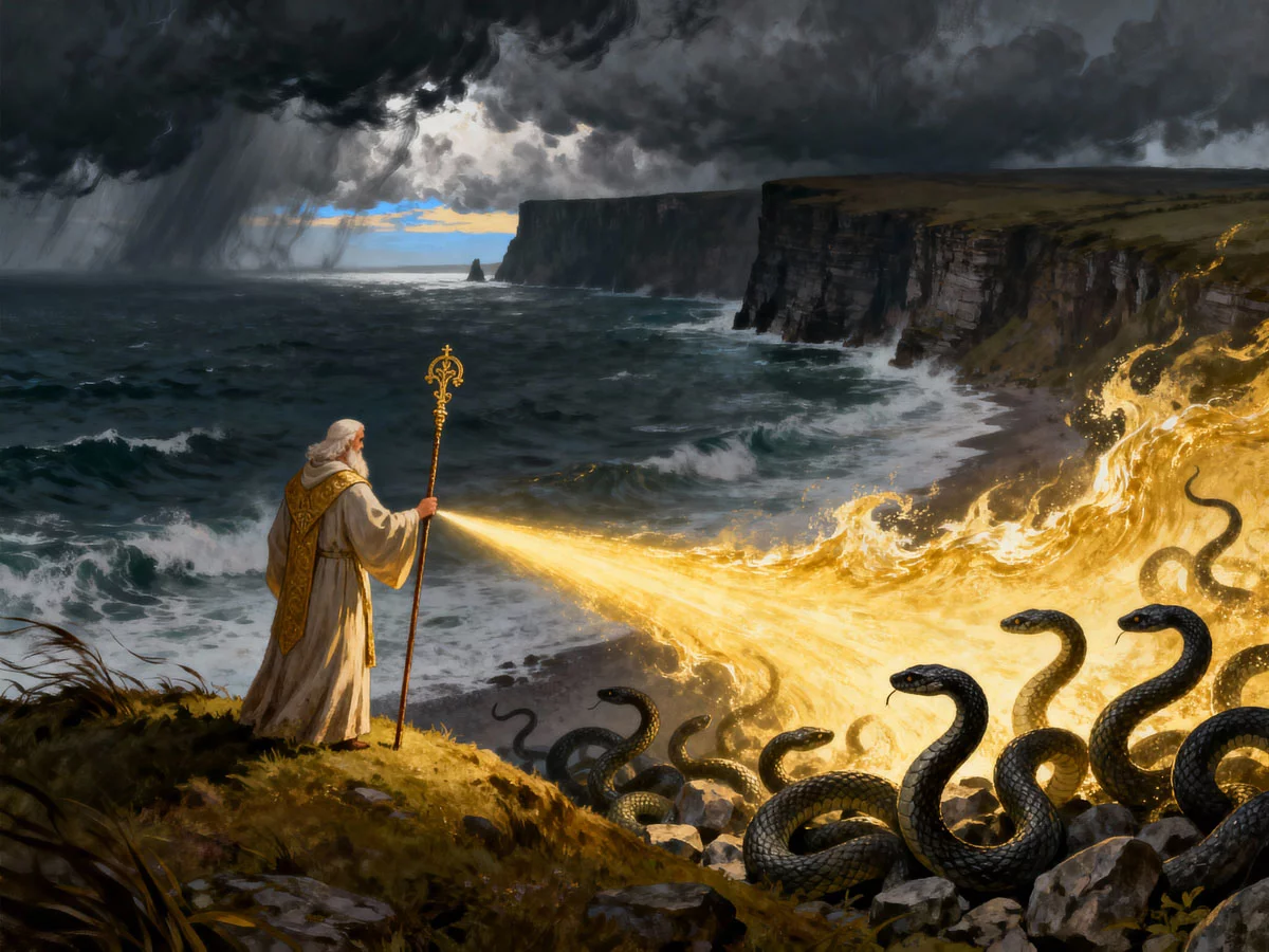 The confrontation was epic. Standing on a high hill overlooking the coast of Clare, with his sacred crozier in hand, Patrick delivered a sermon of such divine power that the very earth trembled. His voice boomed across the valleys, and a holy force swept the land. The serpents, unable to withstand his sacred command, were driven before him. From every corner of Ireland, they swarmed in a great, slithering mass, fleeing west towards the sea.